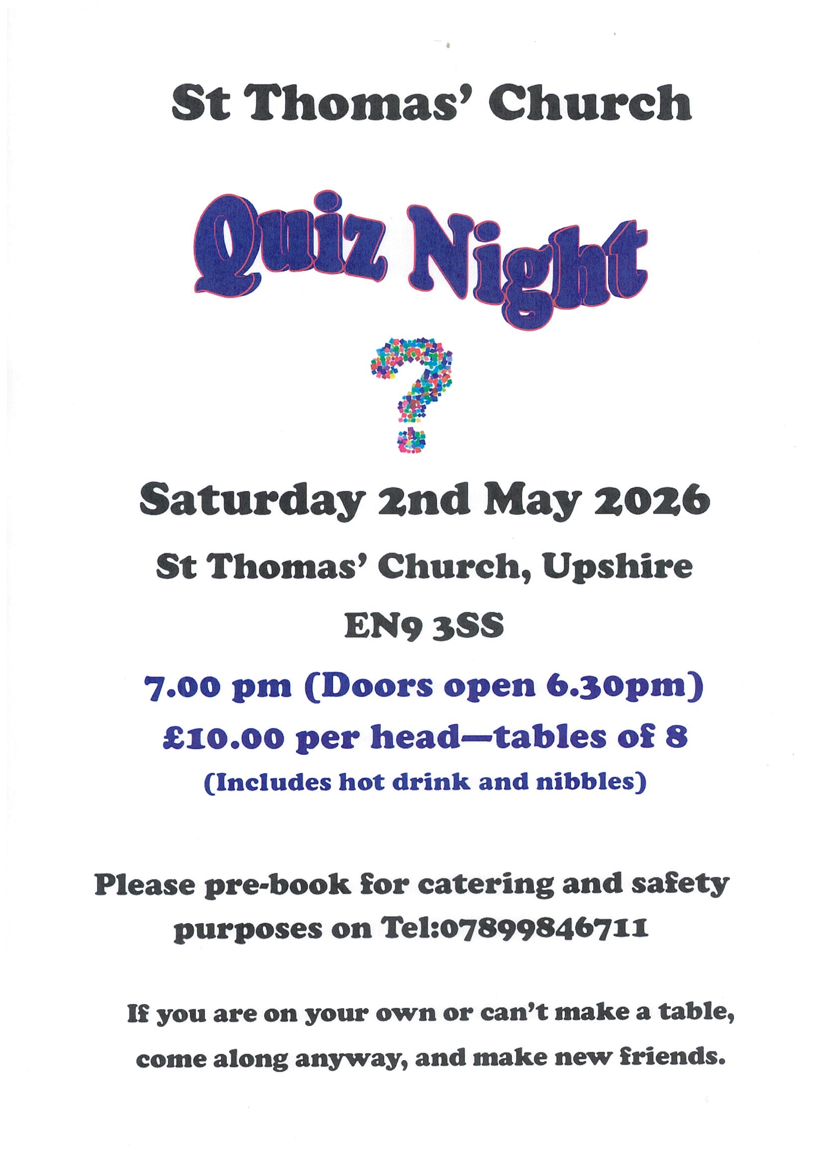 St Thomas' Church Quiz Night Saturday 2nd May 2026- Doors Open 6.30pm for 7pm Start £10pp